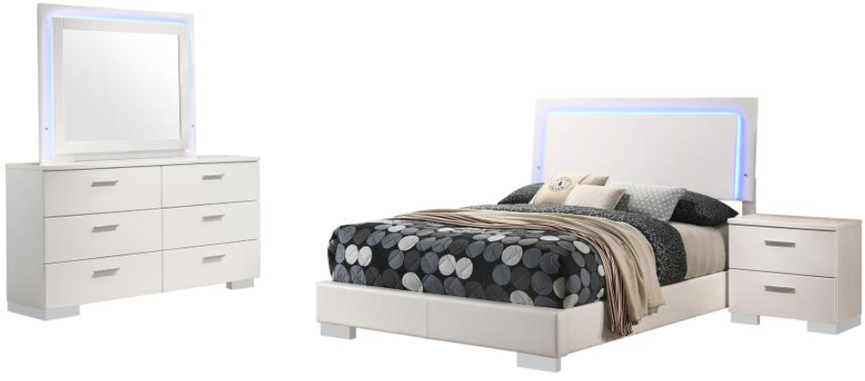 Bedroom set featuring an LED panel bed and LED dresser mirror combination