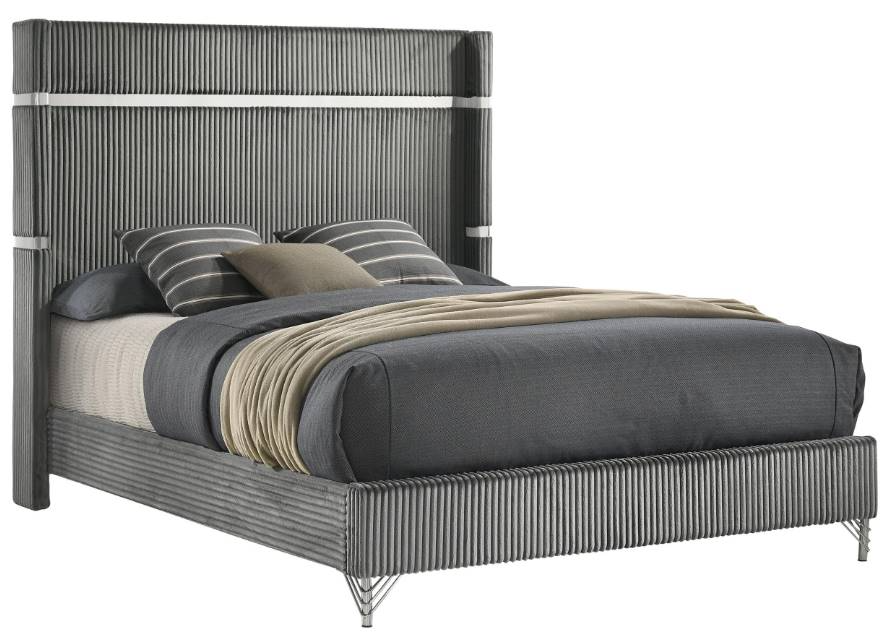 Indulgently soft fabric creates the centerpiece of a modern bed. Its wingback silhouette is timeless and refined, with a low footboard that creates an open, airy look and feel. The tall headboard features stylish bands of gleaming shiny finish trim that create depth and contrast perfectly with the vertical fluted look of the upholstery.Read More