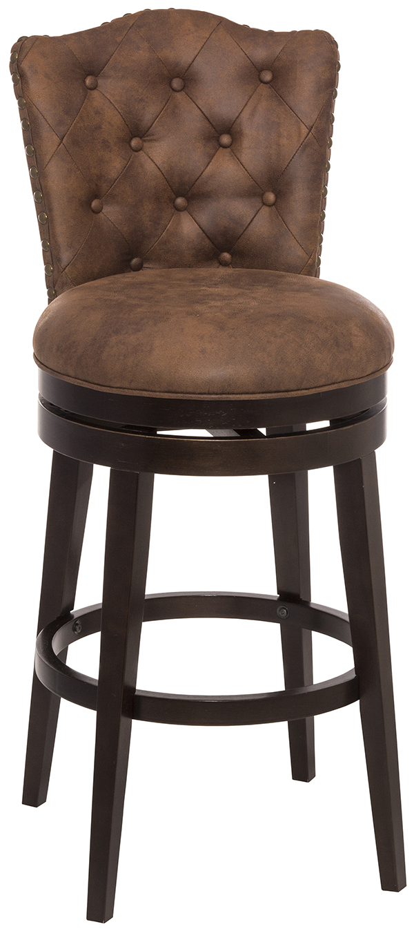 Classy and cushy. The Hillsdale Furniture Edenwood Swivel Bar Height Stool is reminiscent of English pubs -- with all the comforts of modern engineering. Chestnut Brown faux leather with button tufting and nail head trim is timeless; while the compound arch and welt piping around the seat elevates the style and shows attention to detail. The Chocolate Brown wood base features a convenient built-in footrest and 360° swivel functionality for unparalleled comfort. Showcase your sophisticated tastes at your breakfast bar or wet bar with the Edenwood Bar Height Stool. Some assembly required.