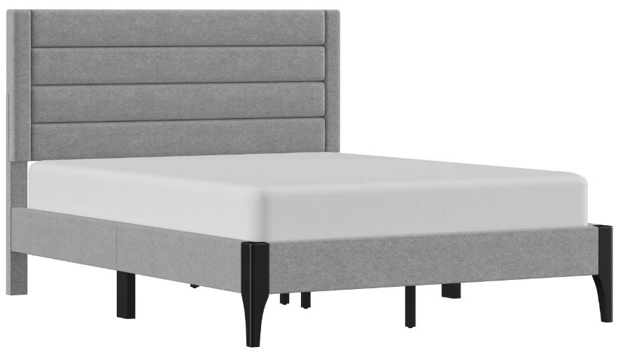 The headboard of this queen platform bed boasts horizontal channel tufting that lends a sleek aesthetic to this piece. These lines run the width of the bed, stopped only by a single vertical tuft on each side of the headboard which further accentuates the clean silhouette. Fully upholstered in a chic light gray except for the two jet-black legs of the footboard, this piece showcases contemporary modern design at its best.