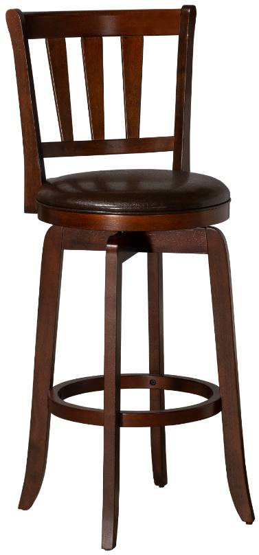 Generously spaced slats taper at the base before joining a high crossrail, creating room for an open back and an airy aesthetic. This 360-degree swivel stool features a timeless cherry finish and a seat upholstered in light brown faux leather, perfect for your kitchen or dining area.