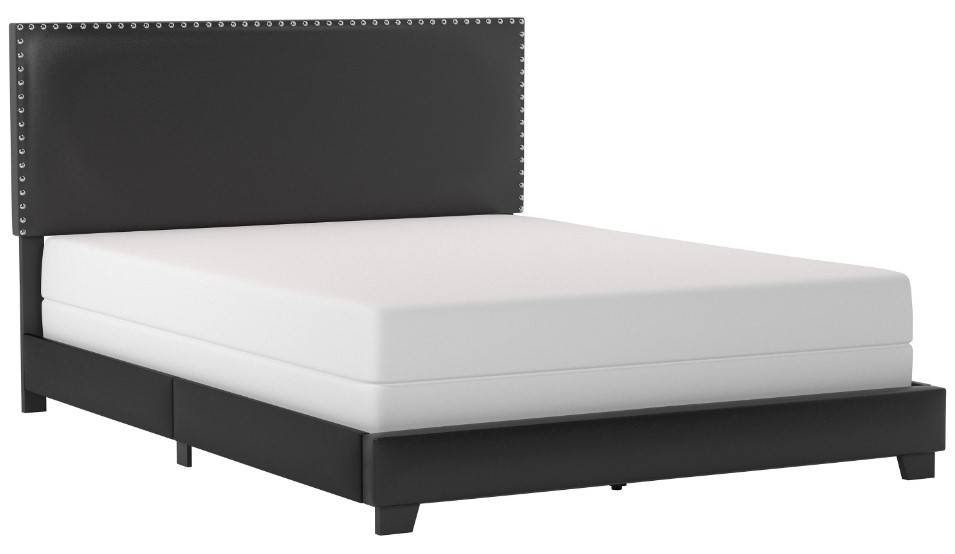 Fully upholstered for a tailored look, the headboard, footboard and side panels are wrapped in a black faux leather that covers its solid wood construction, and sleek feet peek out slightly. True to its casual transitional aesthetic, this queen bed is characterized by clean lines and an understated design that feels fresh.Read More