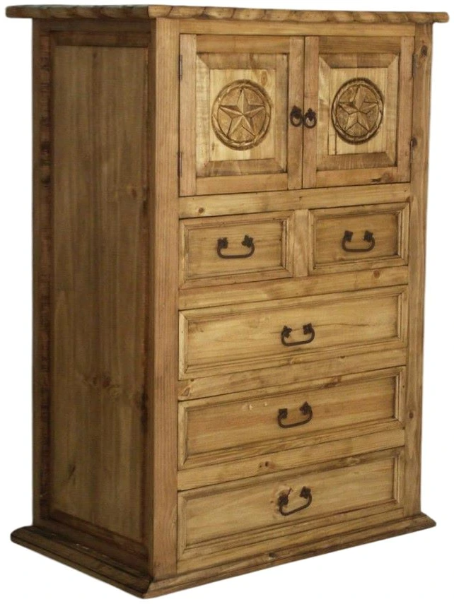 Celebrate charm with the Country Rope and Star chest. Carved star accents and rope details add distinctive character, while the warm honey finish brings a cozy feel. Spacious drawers provide ample storage, blending bold western flair with everyday function in a statement piece built to last.Read More