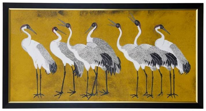 Graceful lines dance, echoing the song of cranes in golden hues against azure skies. Each brushstroke whispers tales of flight and freedom, inviting tranquility into any space, a timeless ode to nature's elegance.Read More